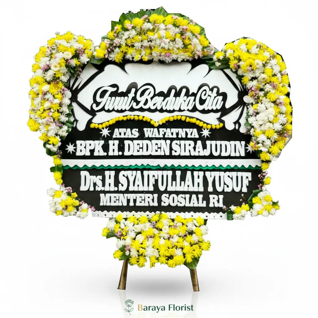 Papan bunga duka cita yang sopan dan penuh empati, dirangkai rapi dan dikirim tepat waktu.