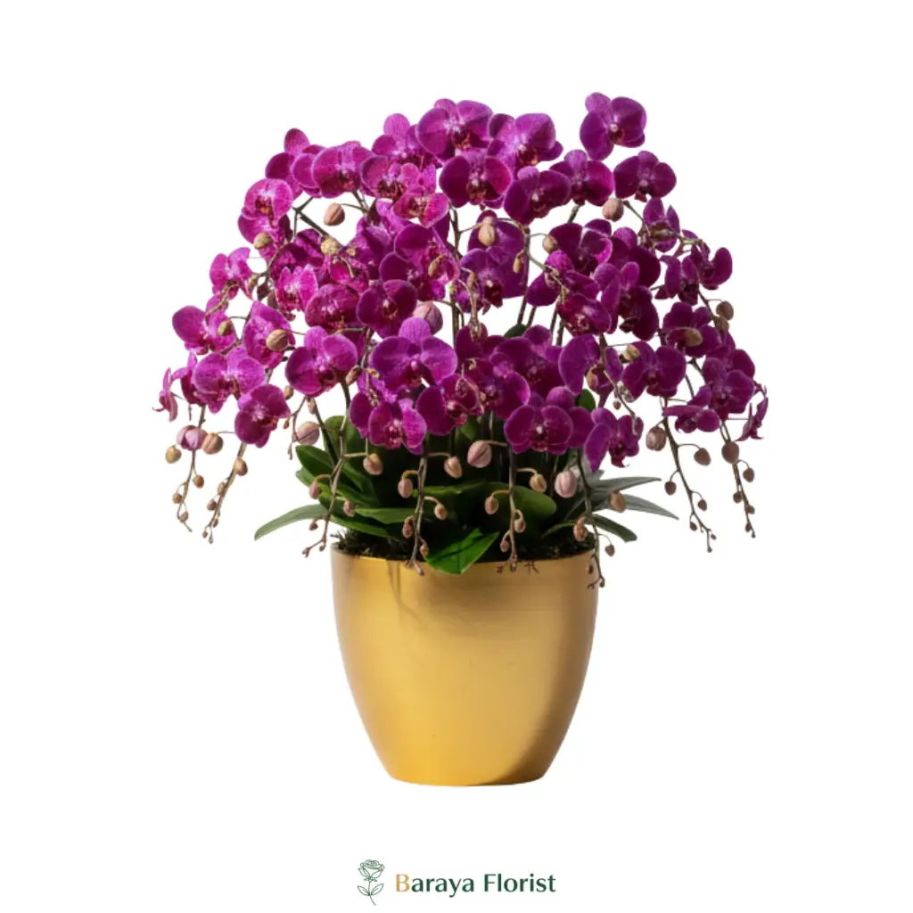 Warna ungu melambangkan kemewahan, penghormatan, dan keanggunan, sementara pot emas memberikan sentuhan eksklusif yang memperkuat kesan prestisius. Perpaduan ini menjadikan rangkaian anggrek tampil elegan sekaligus modern sebagai dekorasi meja.