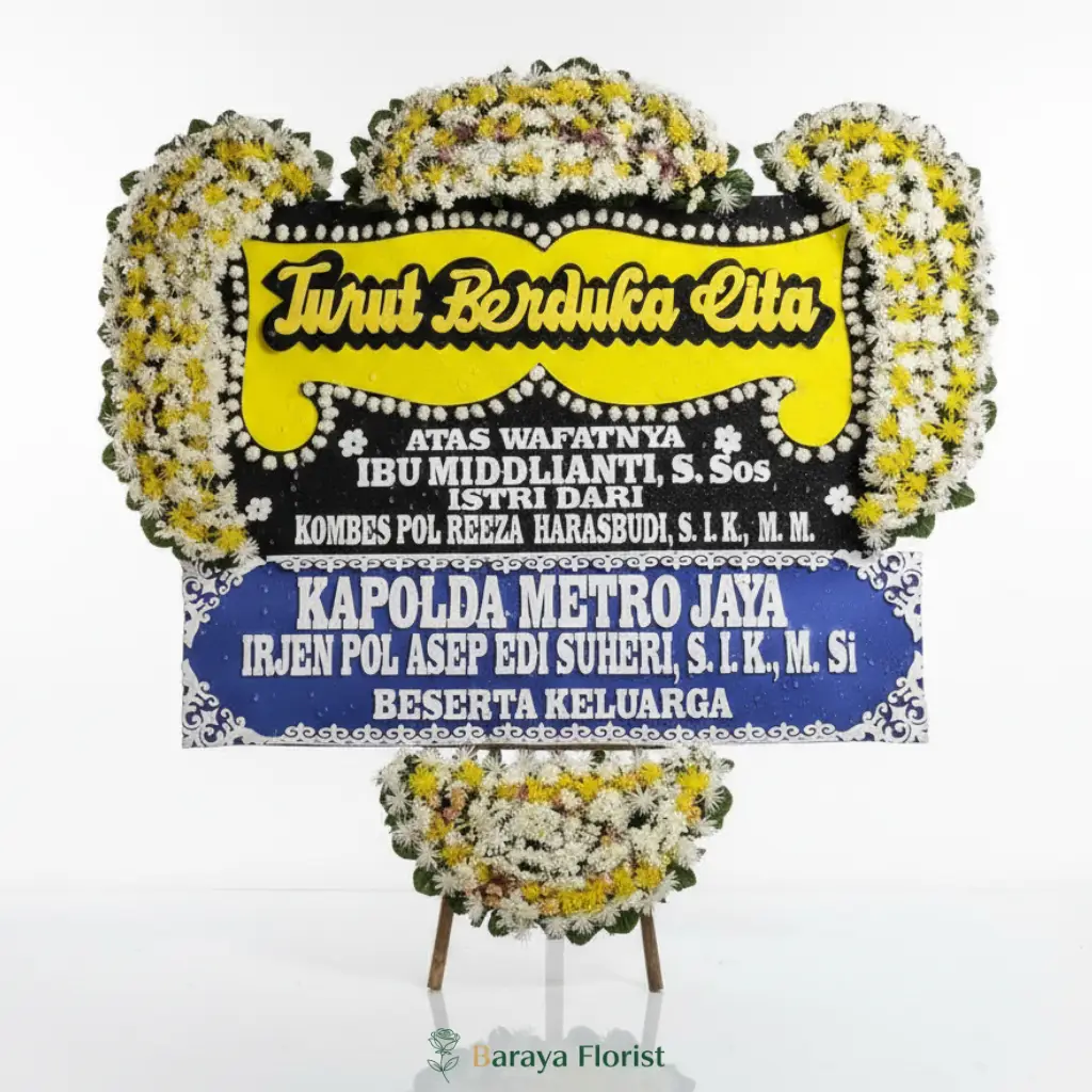 Papan bunga duka cita kuning hitam untuk menyampaikan belasungkawa secara resmi dan penuh empati.