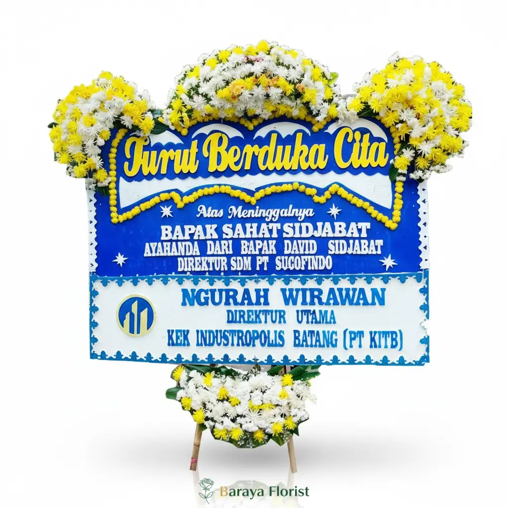 Azure Respect menghadirkan papan bunga duka cita dengan dominasi warna biru, putih, dan kuning yang terlihat elegan sekaligus penuh empati. Pertama, warna biru menciptakan suasana tenang dan berwibawa, sementara bunga putih melambangkan ketulusan doa bagi almarhum. Selain itu, aksen kuning menambah kesan hangat sebagai simbol penghormatan terakhir.