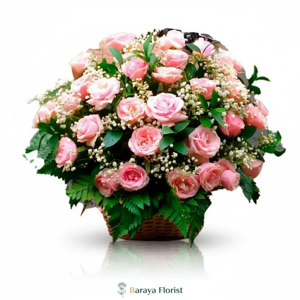 Bunga meja mawar pink dalam keranjang dengan rangkaian manis untuk hadiah, ucapan sayang, dan dekorasi ruangan.
