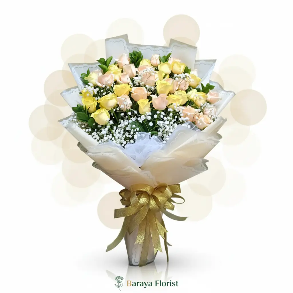 Hand bouquet dengan rangkaian mawar kuning dan peach yang dirangkai padat dan harmonis, dipadukan dengan bunga kecil putih serta dedaunan hijau segar. Buket ini menghadirkan kesan cerah, hangat, dan penuh kebahagiaan, cocok digunakan sebagai hadiah ulang tahun, anniversary, wisuda, maupun ucapan selamat.