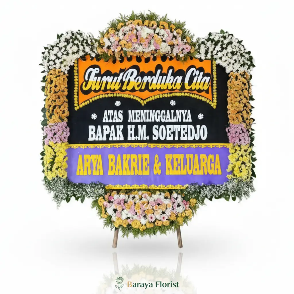Selanjutnya, perangkai menyusun bunga segar secara simetris sehingga tulisan “Turut Berduka Cita” terbaca jelas dari jarak jauh. Dengan penempatan teks yang rapi, pesan simpati tersampaikan secara langsung dan sopan. Oleh karena itu, papan bunga ini sangat cocok digunakan untuk rumah duka, kantor, maupun acara pemakaman resmi.