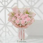 Hand bouquet mawar pink pastel dengan tampilan lembut dan romantis. Cocok untuk ulang tahun, anniversary, wisuda, dan hadiah spesial.