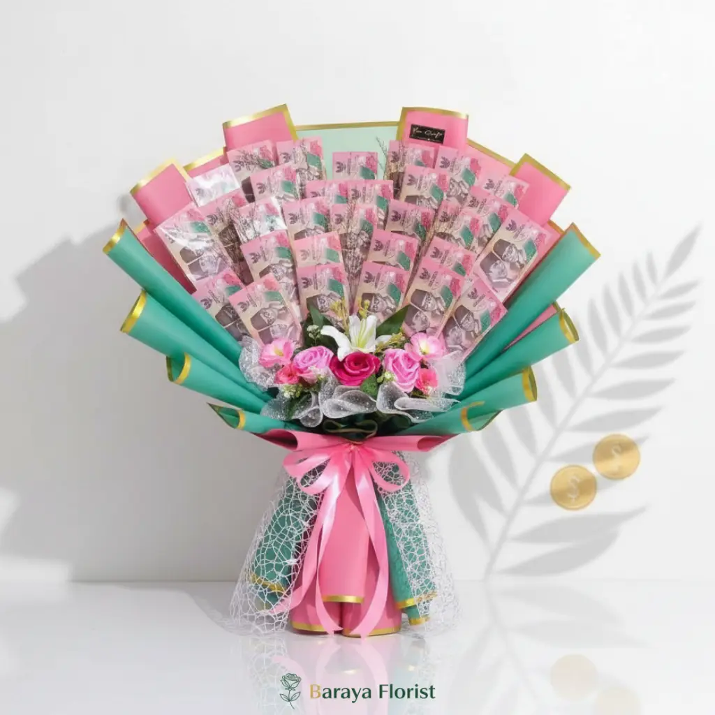Pink Green Royal Money Bouquet dibungkus dengan wrapping berlapis warna hijau dan pink dengan sentuhan lis emas yang memperkuat kesan elegan. Pita besar warna pink di bagian bawah menjadi pemanis visual sekaligus pengikat desain agar terlihat rapi dan simetris.