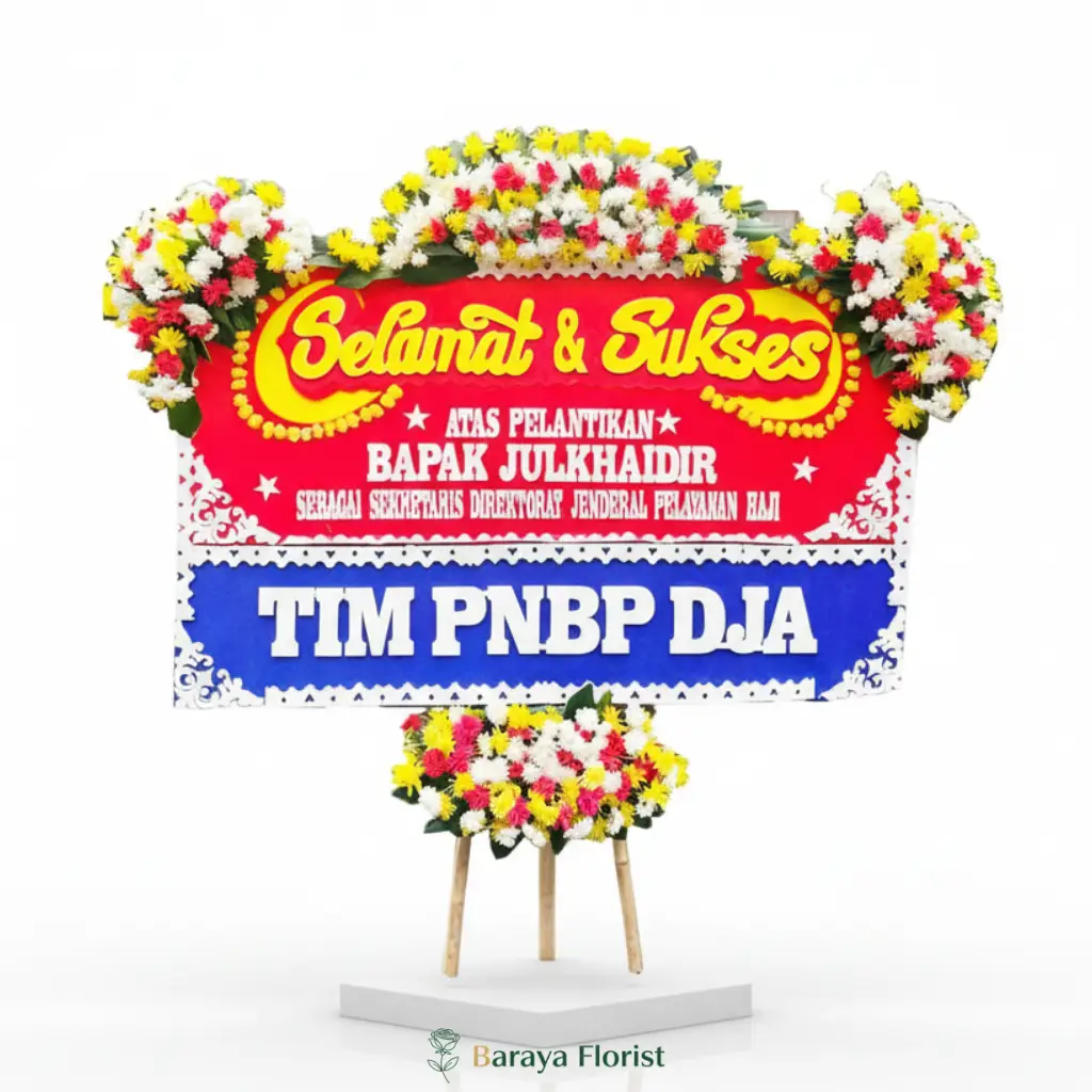 Prestasi Jaya menghadirkan papan bunga selamat dan sukses dengan kombinasi warna merah, kuning, dan biru yang terlihat cerah serta penuh semangat pencapaian. Pertama, warna merah menegaskan energi dan keberanian dalam menyambut jabatan baru. Sementara itu, warna kuning menampilkan optimisme, dan warna biru memperkuat kesan resmi serta profesional.