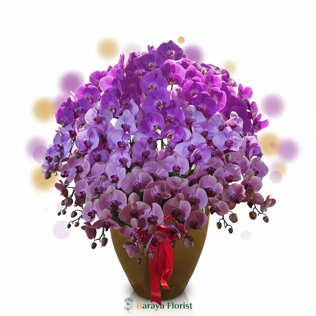 Purple Majesty Orchid Table Bloom adalah rangkaian bunga meja anggrek berwarna ungu dengan gradasi lembut yang disusun penuh dan rapat di dalam pot berwarna emas. Perpaduan warna ungu yang kaya dengan pot emas menciptakan tampilan yang mencolok namun tetap harmonis.