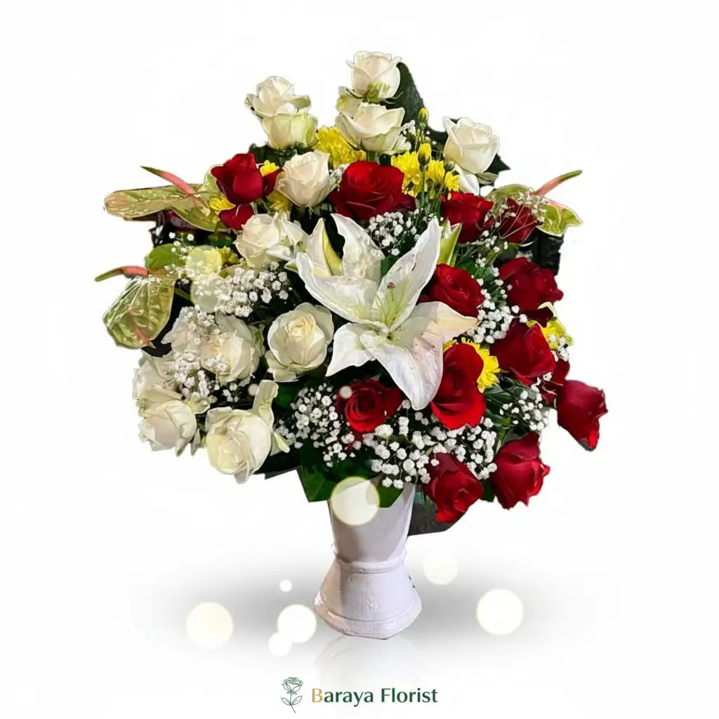 Scarlet Dawn Celebration Table Flower adalah rangkaian bunga meja dengan perpaduan mawar merah, mawar putih, lily putih, dan sentuhan bunga kuning yang menghadirkan suasana cerah serta penuh energi positif. Susunan bunga dirangkai padat dan seimbang dalam vas putih, memberikan tampilan yang rapi dan berkelas untuk berbagai momen istimewa.
