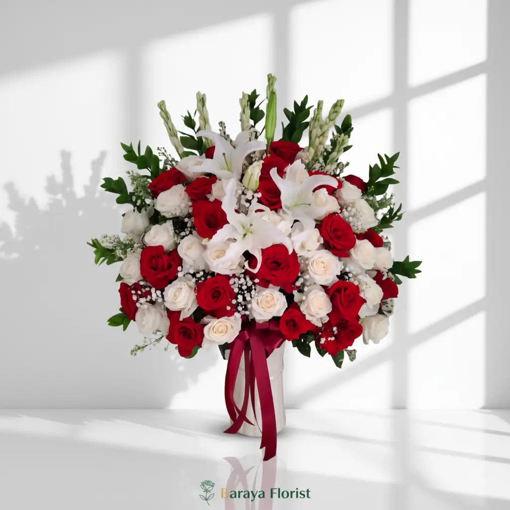 Bunga meja elegan kombinasi mawar merah dan putih dengan sentuhan lily untuk dekorasi ruang tamu atau hadiah spesial yang mewah dan berkesan.