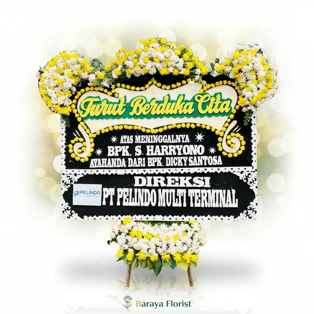 Papan bunga duka cita hitam kuning untuk menyampaikan belasungkawa secara resmi dan penuh penghormatan.