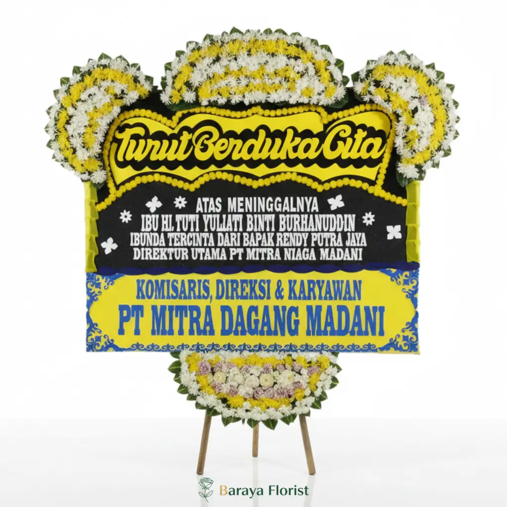 Papan bunga duka cita warna kuning putih dan hitam untuk menyampaikan belasungkawa secara sopan dan penuh penghormatan.